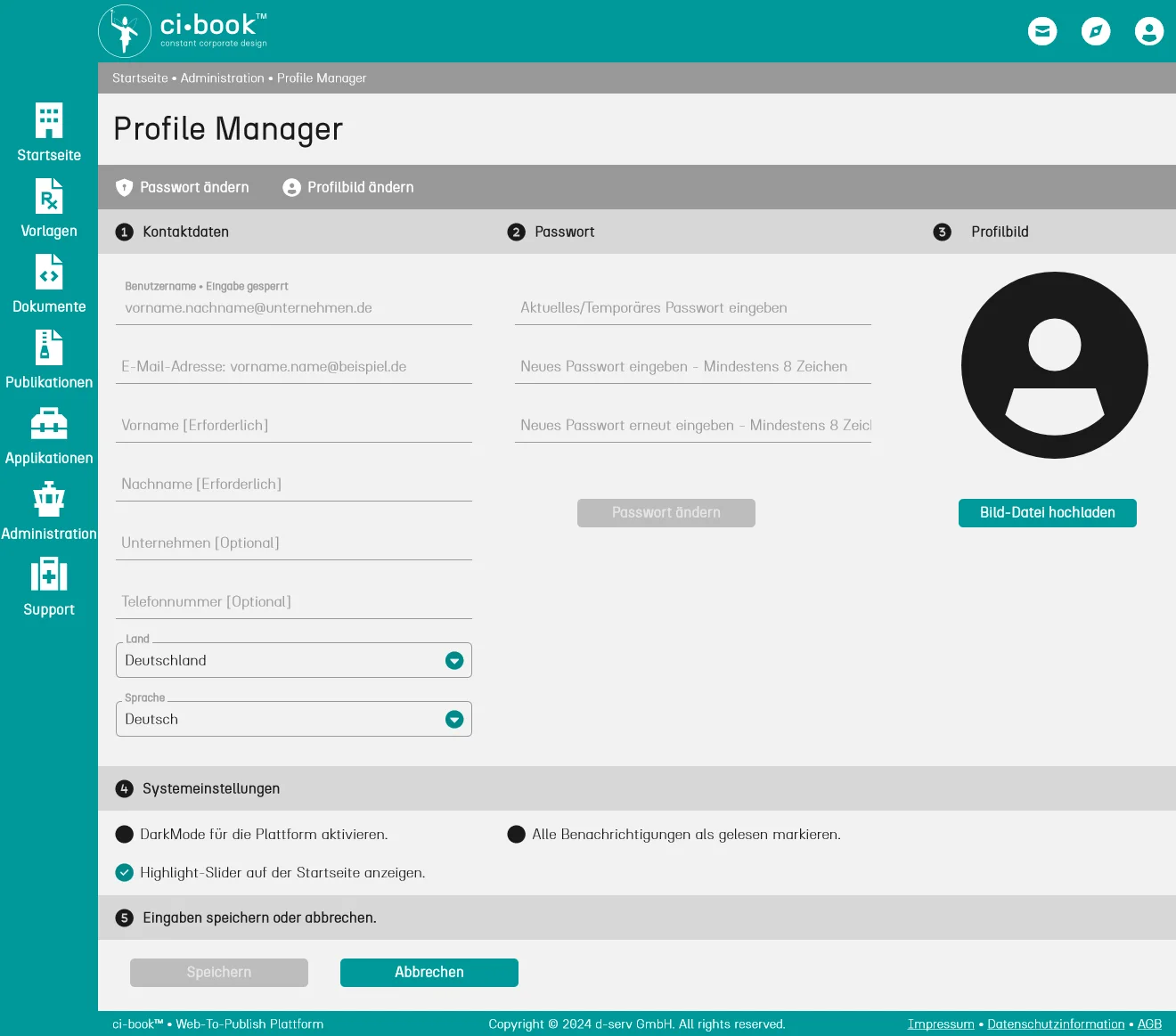 Sofern das Profilbild erfolgreich gespeichert wurde, wird es als kreisrunder Ausschnitt angezeigt; Zum einen direkt unter Punkt 3 im Profile Manager und zum anderen oben, ganz rechts im Bereich der Metanavigation. Falls diese Änderung nicht umgehend zu erkennen ist, sollte zunächst der Button "Speichern" geklickt werden; danach wird der Speichervorgang durch den Hinweis "Ihr Profil wurde gespeichert" bestätigt. Zudem kann es vorkommen, dass manche Webbrowser danach noch immer nicht das aktualisierte Profilbild anzeigen - In diesem Fall sollten sich Benutzer:innen zunächst "Bei ci-book™ abmelden" dann den Webbrowser-Cache leeren und sich anschließend wieder neu "Anmelden"